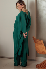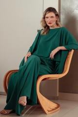 Conjunto de calça longa fluida e blusa assimétrica de mangas longas. Peças confeccionadas em crepe. Calça com fechamento por elástico na cintura e bolsos na cintura.