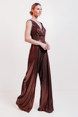Macacão metalizado confeccionado em malha com toque acetinado e caimento fluido, que valoriza os movimentos com brilho bronze sutil. O modelo possui decote V, recortes estratégicos e torção central que esculpe a silhueta com elegância. A calça ampla cria alongamento imediato e confere leveza à peça, ideal para eventos sofisticados com toque contemporâneo.