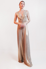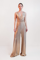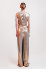 Macacão metalizado confeccionado em malha com toque acetinado e caimento fluido, que valoriza os movimentos com brilho dourado sutil. O modelo possui decote V, recortes estratégicos e torção central que esculpe a silhueta com elegância. A calça ampla cria alongamento imediato e confere leveza à peça, ideal para eventos sofisticados com toque contemporâneo.