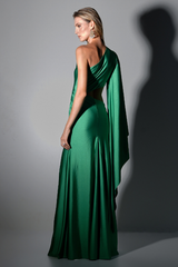 Um encontro entre drama e elegância. Vestido longo de um ombro só, com drapeado assimétrico que se ajusta perfeitamente ao corpo. A manga única longa e fluida adiciona movimento e imponência ao visual. O recorte lateral cria uma silhueta esguia e sensual, enquanto a fenda frontal traz um toque de ousadia. Confeccionado em malha Jersey de brilho sutil, perfeito para destacar-se em ocasiões especiais.