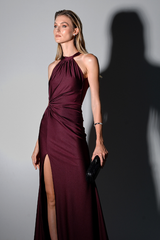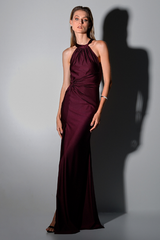 VESTIDO LONGO AMEIXA COM DECOTE HALTER E FENDA