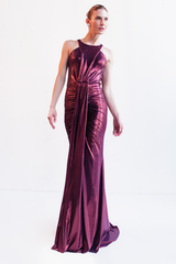 Vestido longo em malha Jersey importada metalizada com  design justo ao corpo realça as curvas com elegância, enquanto o decote halter e as alças trazem um toque moderno e sensual na medida certa. O drapeado frontal e posterior garante movimento e valoriza a silhueta com efeito esculpido, enquanto o recorte profundo nas costas cria um visual marcante e memorável. A textura acetinada e o acabamento luminoso elevam o look com um ar couture, transformando o vestido em peça desejo da temporada.