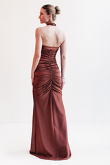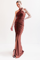 Vestido longo em malha Jersey importada acobreada, com modelagem ajustada ao corpo e franzidos marcantes que percorrem toda a peça em eixo vertical. O decote halter valoriza os ombros e a região do colo, enquanto a fenda frontal adiciona movimento e sensualidade à silhueta. As costas nuas e o acabamento sofisticado refletem o espírito desta coleção: uma celebração da forma feminina em sua versão mais elegante e escultural.