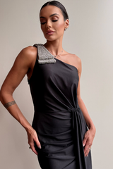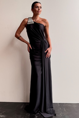 Vestido longo em malha jersey premium, com caimento impecável, fenda lateral e drapeados que valorizam a silhueta. O ombro único, adornado com aplicação de pedraria, traz assimetria e impacto na medida certa. Fechamento por zíper invisível na lateral. Peça não possui bojo.