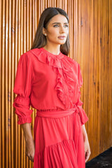 Vestido longo confeccionado em crepe. Modelo com amarração na cintura, manga 3/4 com detalhe de babado em todo colo e mangas . Fechamento com botões encapados na parte da frente .Peça não acompanha bojo
