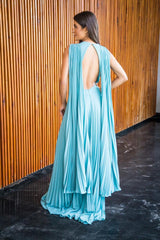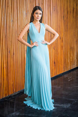 Vestido longo plissado confeccionado em crepe levemente texturizado, decote em V, com capa nas costas. Modelo sem manga, zíper nas costas. Peça não acompanha bojo.