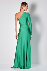 Um ícone de sofisticação e Elegância e glamour definem este vestido longo, que combina um design sofisticado de um ombro só com uma manga longa justa ao corpo. As fendas estratégicas acrescentam sensualidade e fluidez ao look, enquanto as aplicações de cristais prateados no ombro elevam o brilho e a sofisticação da peça. Uma escolha perfeita para eventos de alto luxo.