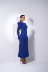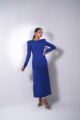 Vestido manga longa, ombreiras, costas aberta com detalhe em tiras, longuete e não acompanha bojo.