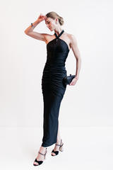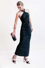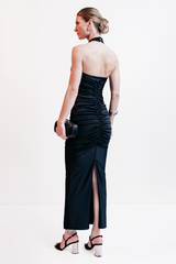 Vestido midi confeccionado em malha jersey importada, que confere brilho sofisticado e toque macio. O design apresenta decote halter com torção frontal, valorizando o colo com elegância. A modelagem justa ao corpo realça a silhueta, enquanto o drapeado central com franzidos verticais ao longo de toda a peça cria um efeito escultural e alongado. Fenda posterior sutil garante mobilidade e sensualidade equilibrada. Fechamento por amarração no pescoço, sem zíper, proporcionando caimento impecável e acabamento limpo. Ideal para eventos noturnos e ocasiões especiais que pedem impacto visual e sofisticação contemporânea.