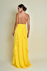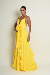 Vestido longo fluido de alcinhas, com decote em V. Confeccionado em crepe com recortes nas costas. Fechamento por zíper nas costas. Peça não possui bojo. Forro com o próprio tecido e amarração com babados na frente da peça.