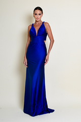 Vestido longo frente única, confeccionado em jersey com decote profundo nas costas. Fechamento por zíper e drapeado nas costas. Peça não possui bojo. Forro com o próprio tecido e fenda na lateral.