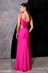 Vestido longo de alças, confeccionado em jersey com recortes no busto e drapejado nas costas. Fechamento por zíper nas costas. Peça não possui bojo. Forro com o próprio tecido e fenda na lateral.