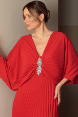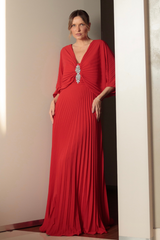 Vestido longo fluido com mangas longas, decote em V, confeccionado em crepe plissado e aplicação de cristal no decote. Fechamento por zíper nas costas. Peça não possui bojo. Forrado com o próprio tecido.