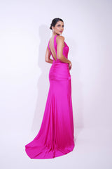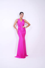 Vestido com pala vertical na cintura, alça, não acompanha bojo, franzido frente e costa, decote em V frente e costa, forro com mesmo tecido do vestido e leve calda.