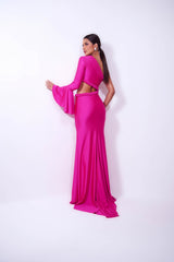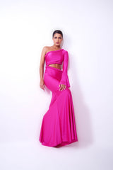Vestido longo de um ombro só, recorte na cintura e detalhe trançado, manga com abertura em boca de sino e leve calda.