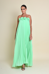 Vestido longo fluido tomara que caia. Confeccionado em crepe plissado, com detalhes de flores no decote. Fechamento por zíper nas costas. Peça não possui bojo. Forro com o próprio tecido e fenda frontal.