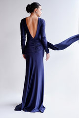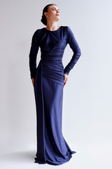 Longo com gola canoa e mangas longas. A frente apresenta um drapeado lateral assimétrico que percorre todo o tronco, conferindo textura e movimento. Decote profundo em "U" com acabamento em drapeado ruched na cintura posterior, elevando a estética da peça através de detalhes manuais. Jersey fluido com leve acabamento acetinado, garantindo que o drapeado lateral se molde ao corpo com perfeição.