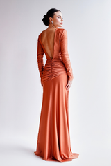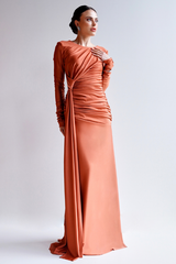 Longo com gola canoa e mangas longas. A frente apresenta um drapeado lateral assimétrico que percorre todo o tronco, conferindo textura e movimento. Decote profundo em "U" com acabamento em drapeado ruched na cintura posterior, elevando a estética da peça através de detalhes manuais. Jersey fluido com leve acabamento acetinado, garantindo que o drapeado lateral se molde ao corpo com perfeição.