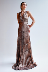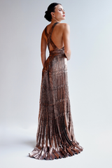 VESTIDO LONGO METALIZADO PLISSADO COM CORPO DRAPEADO UNITY SEVEN