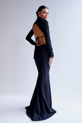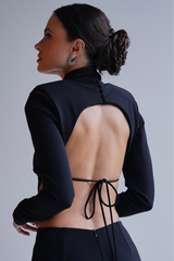 Este modelo destaca-se pelo rigor geométrico e pela valorização da silhueta através de técnicas de drapeado e estrutura. Construção com torção central (twist) e drapeados radiais que convergem para o centro, criando um volume tridimensional refinado. Possui recorte keyhole (gota) sutil no centro do decote. Decote profundo em "V" que se estende até a região lombar, onde inicia-se um detalhe em drapeado ruched (franzido vertical), técnica projetada para esculpir e valorizar a linha do quadril. Crepe de alfaiataria premium com alta gramatura e elastano, proporcionando estrutura firme e acabamento fosco sofisticado.