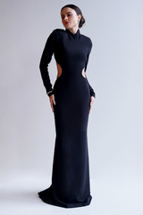 VESTIDO LONGO PRETO COM MANGAS E RECORTES NA CINTURA UNITY SEVEN