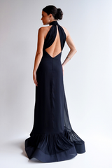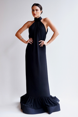 A parte superior apresenta gola alta drapeada estilo halter, com franzidos verticais que partem do decote e criam alongamento visual. A construção posterior revela costas amplamente abertas, com tecido transpassado que forma desenho escultural e sofisticado.