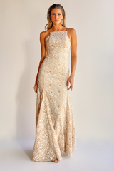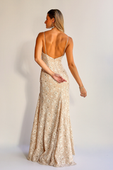 Confeccionado em tecido bordado com flores em relevo e fios metálicos sutis, ele encanta pelo brilho discreto e acabamento refinado. Apresenta decote reto com alças finas e um caimento ajustado ao corpo, que valoriza as curvas de forma elegante. As costas abertas com decote profundo adicionam um toque de sensualidade na medida certa, enquanto a saia fluida e levemente godê garante movimento.