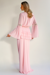 Composto por uma blusa de mangas longas amplas e saia longa com babados sutis, ele combina movimento e leveza. A blusa possui decote com amarração e detalhes rendados que valorizam o colo, enquanto a saia longa apresenta modelagem fluida e cintura com elástico que proporciona conforto e ajuste perfeito. Versátil, o conjunto pode ser usado com amarração na cintura, destacando a silhueta, ou sem, para um visual mais solto e leve.