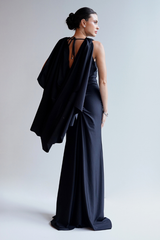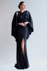 VESTIDO LONGO PRETO COM CAPA E DRAPEADOS UNITY SEVEN