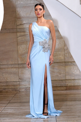 Vestido longo de um ombro só, confeccionado em jersey com drapejado nas laterais e costas. Aplicação de flor em cristal na lateral. Fechamento por zíper na lateral. Peça não possui bojo. Forro com o próprio tecido e fenda na lateral.