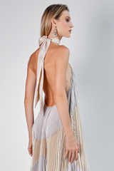 Imponente e sofisticado, este vestido longo fluido é confeccionado em tecido metalizado plissado, criando um efeito de brilho e movimento. O design bicolor em tons dourado e prata adiciona modernidade e sofisticação. A modelagem leve e esvoaçante contrasta com o decote halter estruturado, que realça o colo com elegância. O fechamento por amarração nas costas garante um ajuste impecável, enquanto o decote profundo nas costas confere um toque sensual e sofisticado. Ideal para eventos de gala e ocasiões especiais.