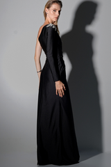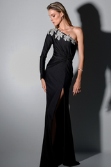 Um ícone de sofisticação e Elegância e glamour definem este vestido longo preto, que combina um design sofisticado de um ombro só com uma manga longa justa ao corpo. As fendas estratégicas acrescentam sensualidade e fluidez ao look, enquanto as aplicações de cristais prateados no ombro elevam o brilho e a sofisticação da peça. Uma escolha perfeita para eventos de alto luxo.