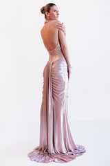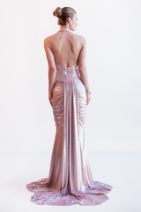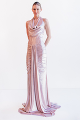 Vestido longo em malha Jersey  importada combina caimento impecável com brilho sofisticado. O decote halter com gola drapeada valoriza o colo com suavidade, enquanto o recorte nas costas imprime sensualidade na medida certa. O efeito franzido frontal e traseiro cria movimento e afina visualmente a silhueta, desenhando o corpo com elegância.