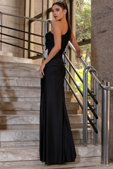 Vestido longo de um ombro só, confeccionado em jersey com drapejado nas laterais e costas. Aplicação de flor em cristal na lateral. Fechamento por zíper na lateral. Peça não possui bojo. Forro com o próprio tecido e fenda na lateral.