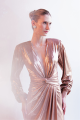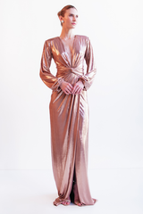 Vestido longo em malha metalizada na tonalidade rose gold, com caimento fluido e brilho acetinado que valoriza cada movimento. A peça apresenta decote em V profundo e torção central estratégica que destaca a silhueta feminina com sofisticação. Mangas longas com leve volume e punhos delicadamente ajustados imprimem elegância atemporal. A cintura marcada é complementada por drapeados sutis, que proporcionam efeito alongado e refinado à composição. Fechamento posterior por zíper invisível. Ideal para eventos noturnos que pedem presença marcante e luxo contemporâneo.