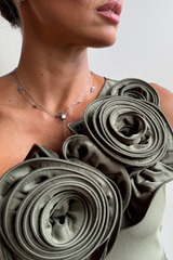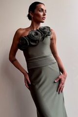 Elegância atemporal e sofisticação definem este vestido longo preto. Com modelagem justa ao corpo, valoriza a silhueta e exala refinamento. O decote assimétrico recebe um detalhe exuberante de rosetas feitas à mão, trazendo um toque artístico e romântico. A cintura drapeada destaca ainda mais a feminilidade da peça. Perfeito para eventos de gala e ocasiões especiais que pedem um look marcante e sofisticado