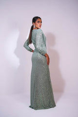 VESTIDO LONGO PAETÊ MANGA DRAPEADA VERDE