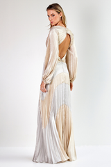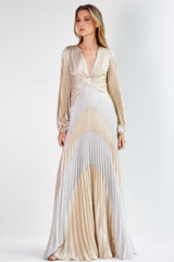 O brilho e a fluidez em perfeita harmonia. Com um sofisticado trabalho de plissado bicolor, este vestido cria um efeito gráfico deslumbrante, valorizando o movimento e a leveza da peça. O decote em V profundo alonga o colo, enquanto o drapeado na cintura destaca a feminilidade com um toque vintage. As mangas longas bufantes adicionam um ar de realeza, tornando-o a escolha ideal para quem busca um visual imponente e sofisticado.