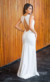 Vestido longo confeccionado em jersey com nó na cintura e alças torcidas. Fechamento por zíper nas costas. Peça não possui bojo.
